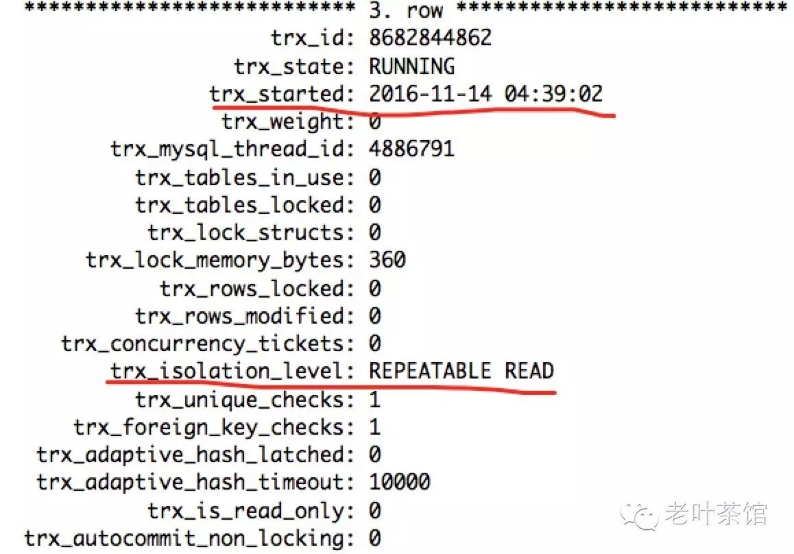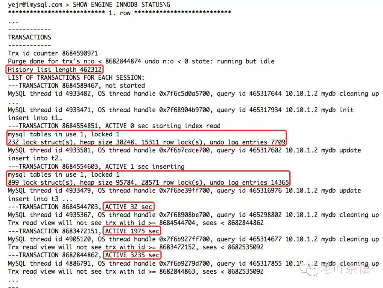 个别事务启动太久一直没提交(TRANSACTION 8682844862, ACTIVE 3235 sec,将近1个小时);