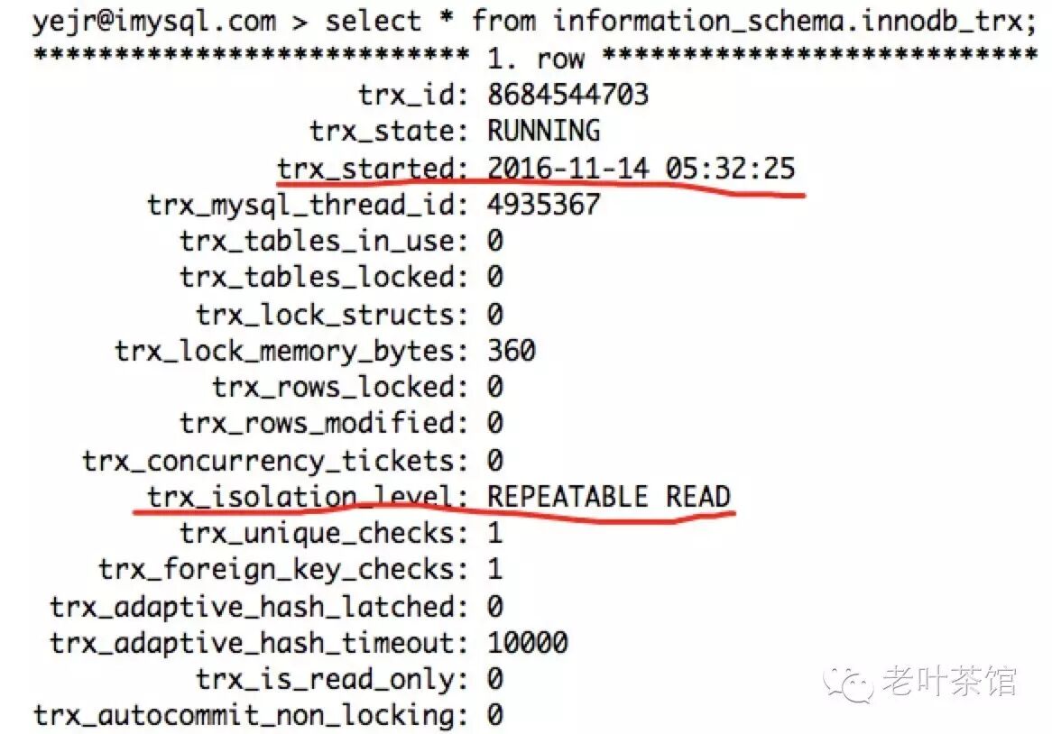 我们先来看下 information_schema.innodb_trx 视图,这个视图记录了当前所有活跃事务列表: