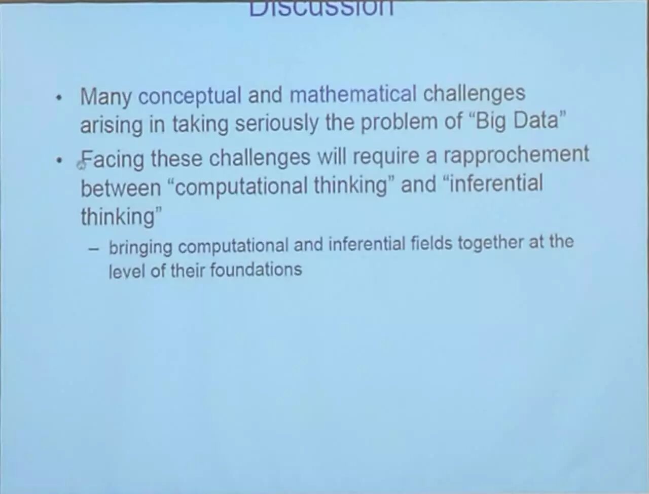这些领域中传统的视角和思路不足以解决“大数据”中凸显的难题,这显然是由于在基础性的层面,二者存在突出的分歧。在计算机科学中,数据点数量的增长是”复杂性“的来源,必须通过算法或者硬件来训练。而在统计学中,数据点数量的增长是”简单性“的来源,它能让推理在总体上变得更强大,引出渐进式的结果。