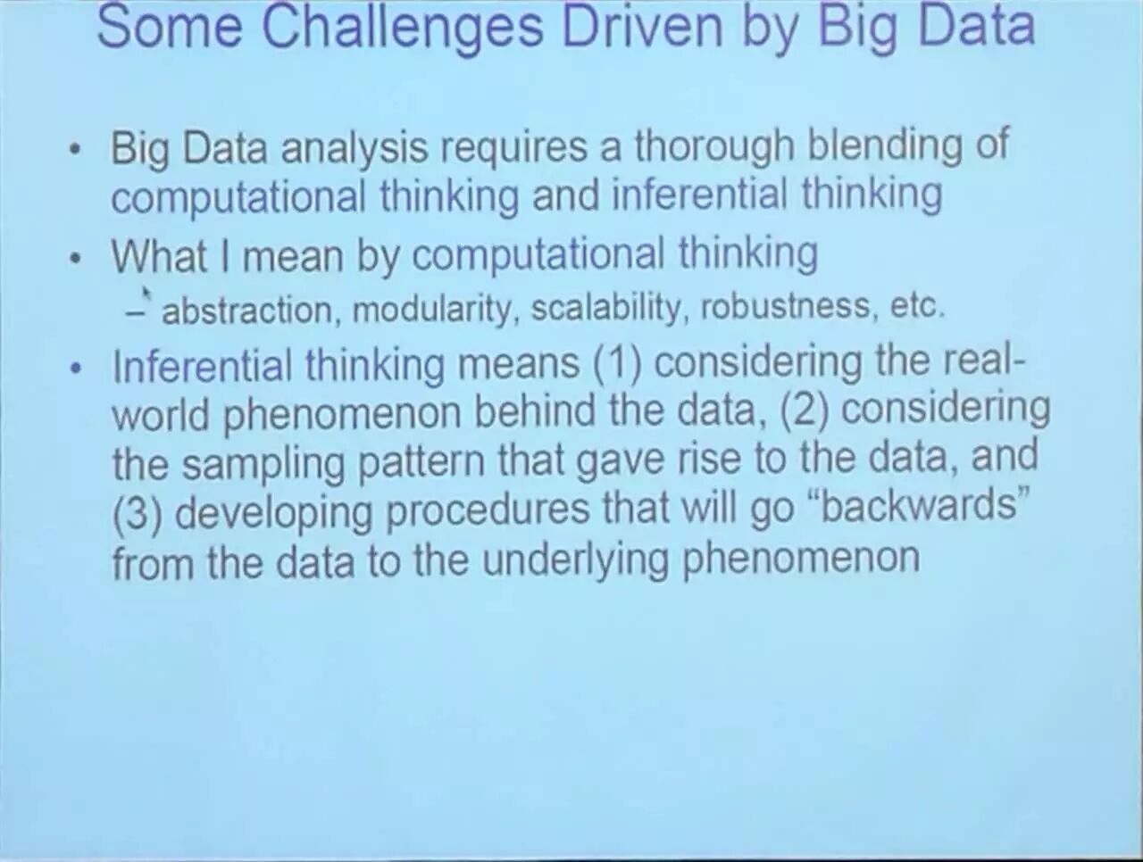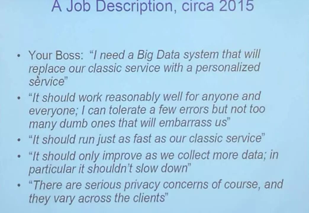 Jordan 从一个职位描述讲起,介绍大数据带来的挑战,引出演讲主题:“大数据”时代同时需要计算思维和推理思维。