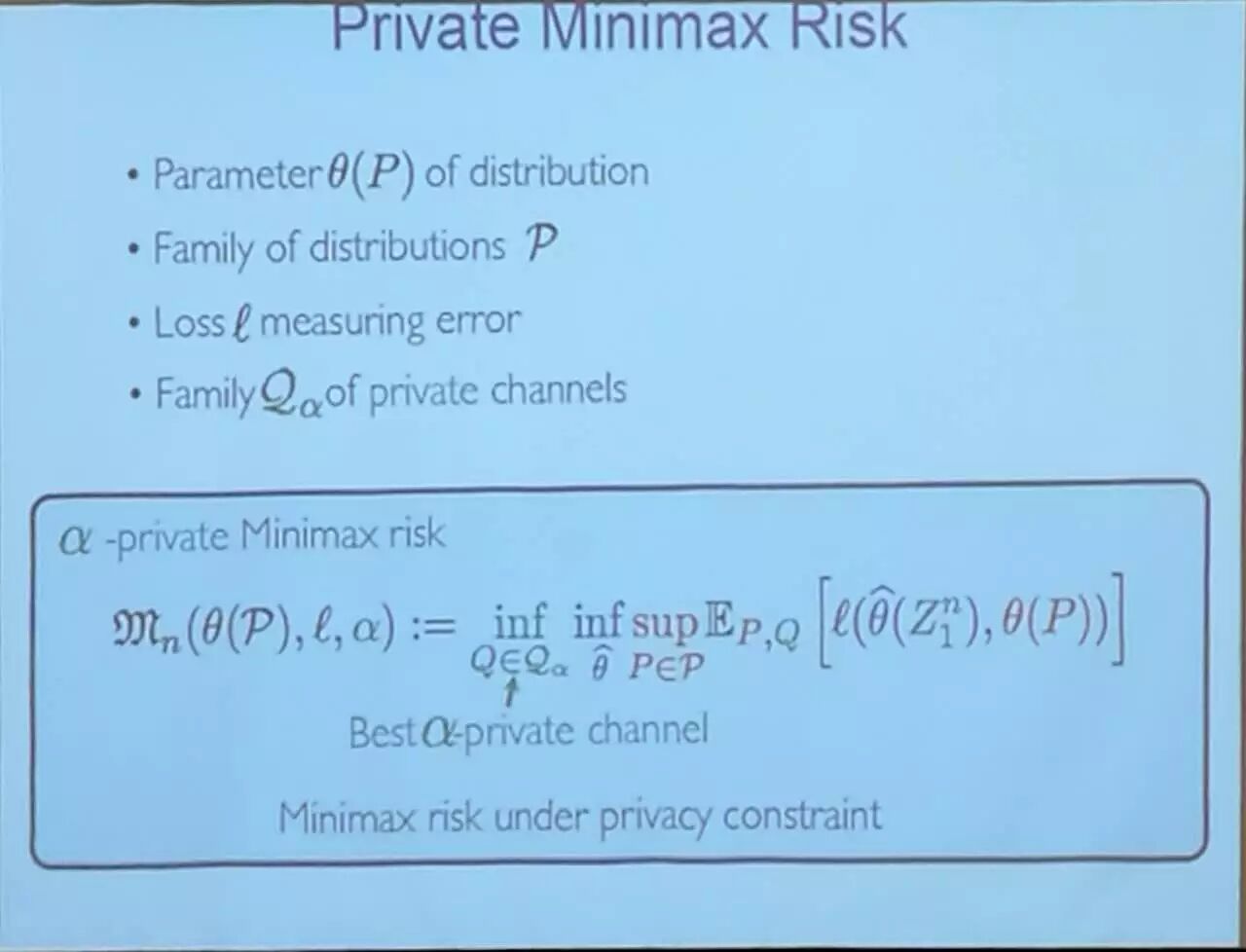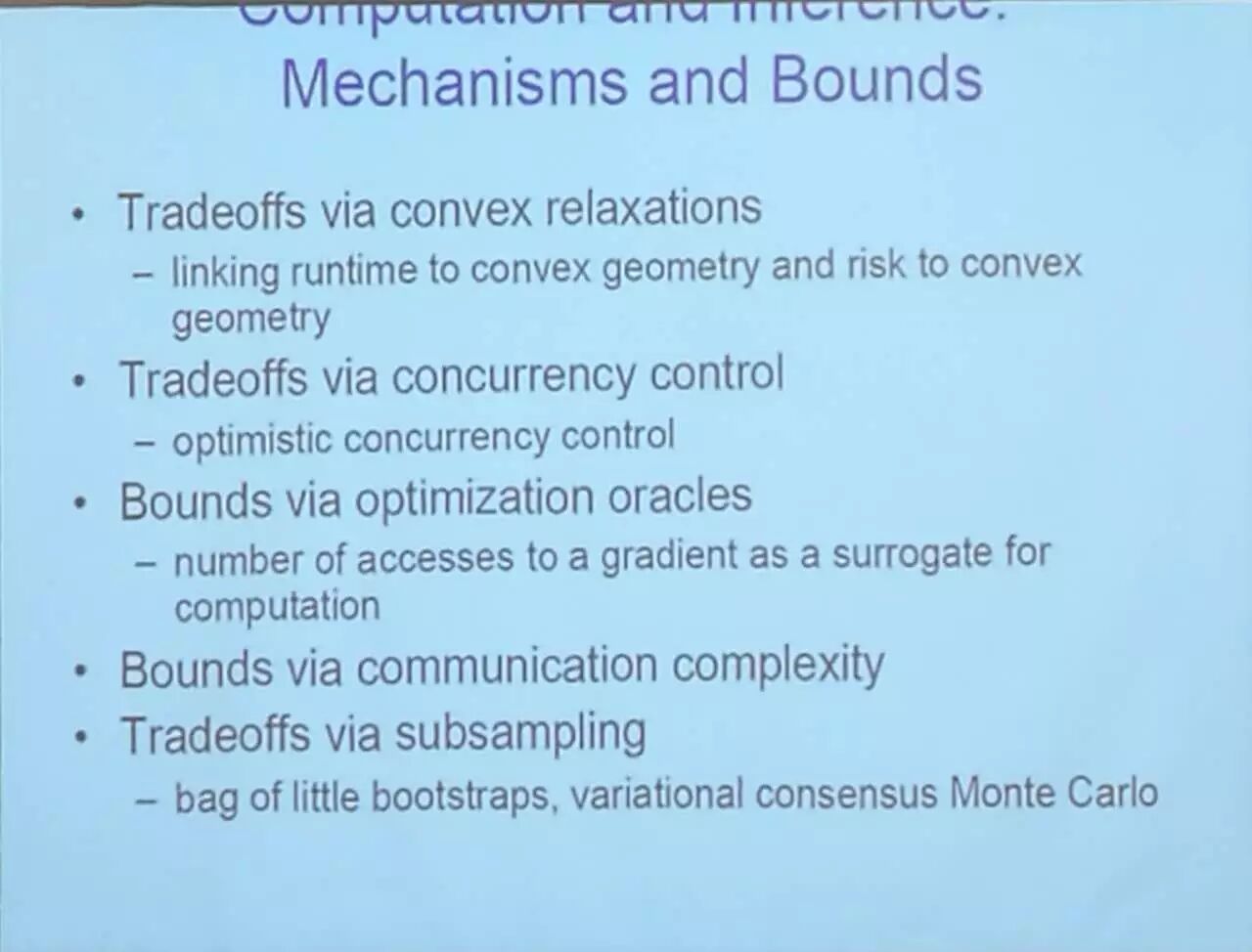 演讲展示了几个研究,用以为计算学和统计学搭建起桥梁,其中包括在隐私和交流限制下的推理问题,以及推理的速度和准确率之间达成平衡的方法。