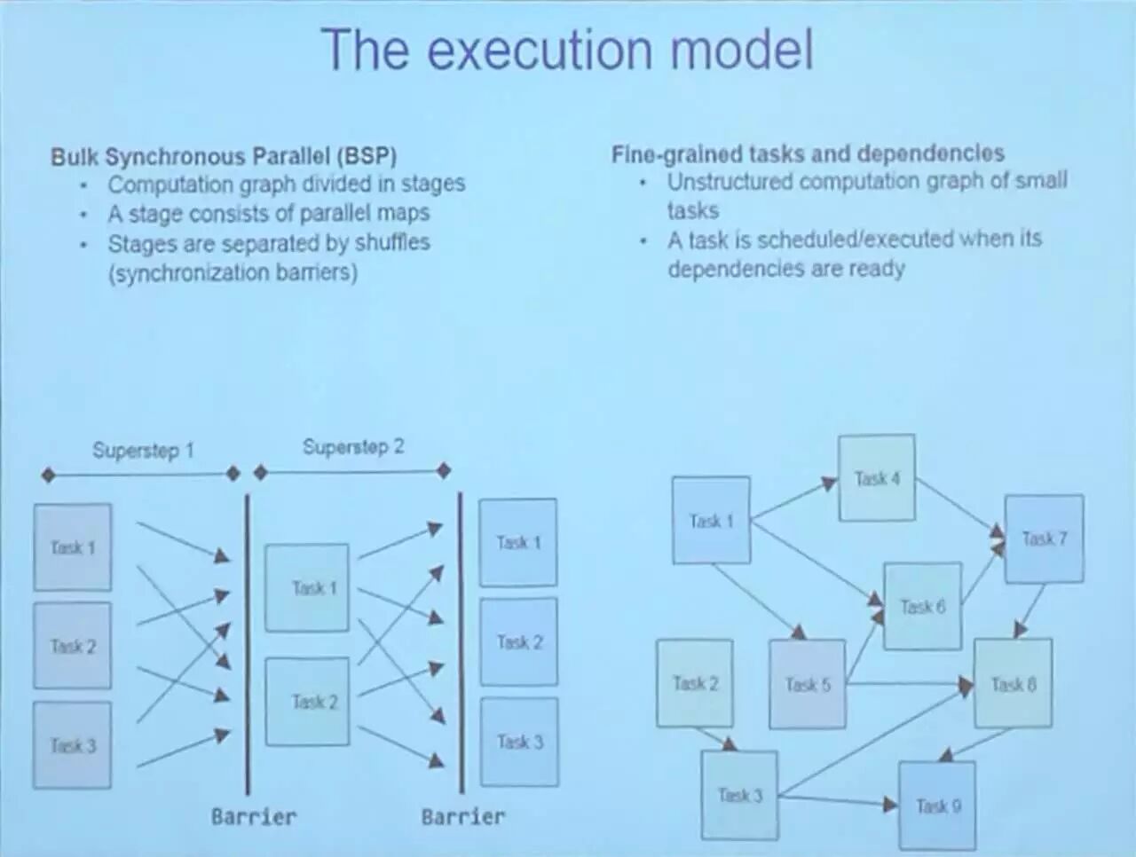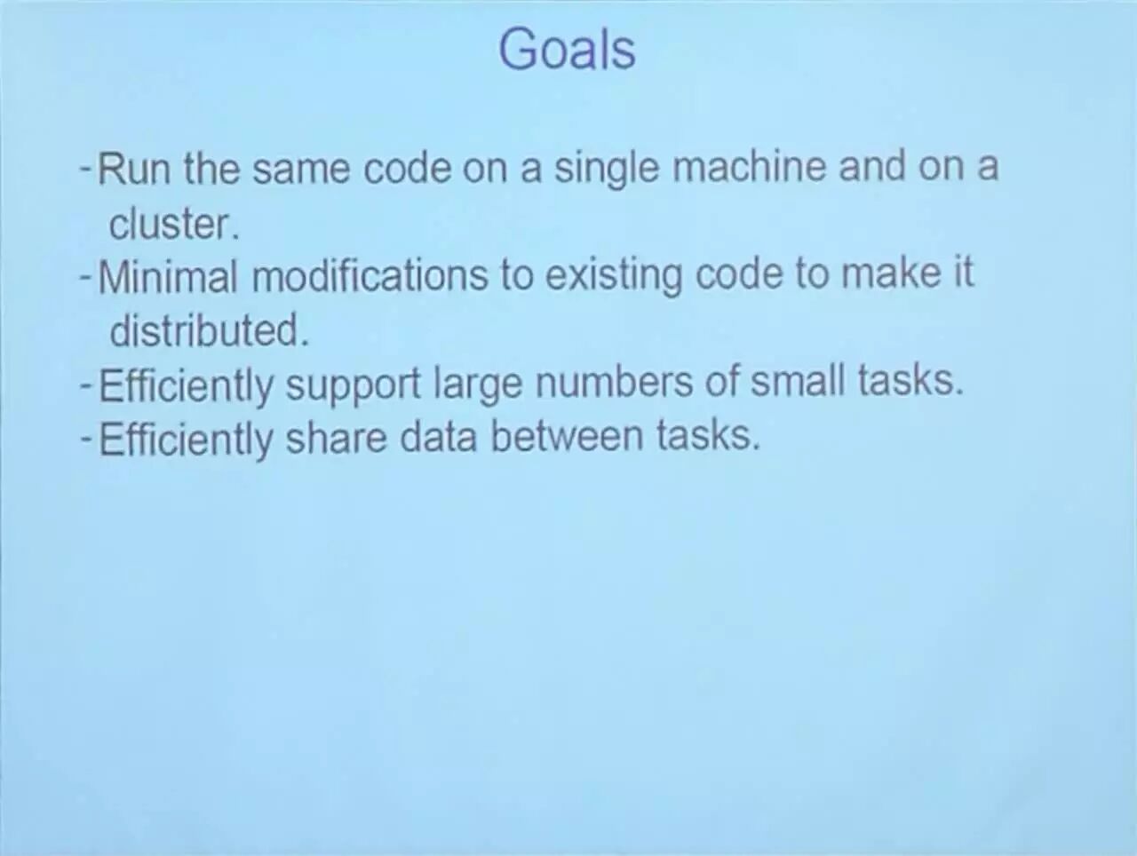 在单机上运行相同的代码和簇;对既有的代码进行最小化的修正,让其变得可分布;有效地支持大量的小任务;在任务间有效地分享数据