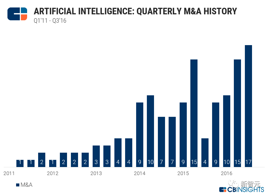 2016年,每一个季度,都有至少10起关于人工智能的并购发生。这一指数级的增长趋势从2014年开始,目前没有任何下降的趋势。