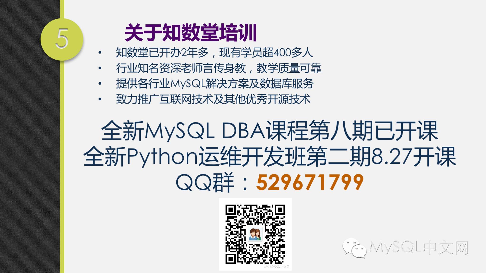 【提示】知数堂培训全新MySQL DBA课程第八期已火爆开课,全新Python运维开发班第二期8.27开课,请加入QQ群:529671799 获得最新信息。