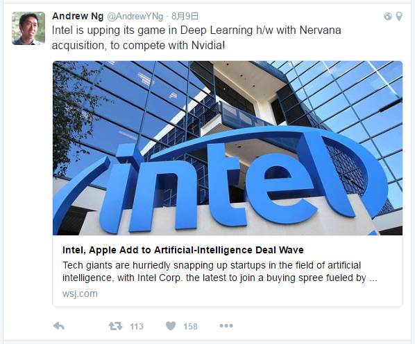 今年 8 月,Nervana Systems 以4.08 亿美元被英特尔收购,引发业界轰动。百度首席科学家吴恩达当时在Twitter发消息称,英特尔这是要在深度学习上跟英伟达开战了!