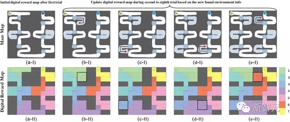 研究人员首先考察了生化鼠是否能从记录下的迷宫图中提取出空间地图,并且形成 MFB 奖励规则。实验中,经过 V1 鼠在迷宫中的不断行走,计算机系统的 Q-Learning 算法生成了数字奖励地图。根据小鼠的位置和奖励地图,算法生成了实时的 MFB 刺激参数,用于指导生化鼠在迷宫中行走。当接近终点时,计算机对小鼠 MFB 的刺激会增强。