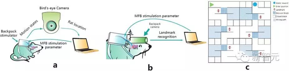 实验前,所有的小鼠都停水两天,经过改造,大脑植入电极并连接计算机,从而成为智能增强的生化鼠。这种生化鼠走迷宫时,计算机系统上的学习算法和规则运算会根据摄像头传来的视频输入计算 MFB 的刺激参数(电压、频率、占空比和脉冲数),从而对小鼠进行指导。实验中,生化鼠在没有人类干预的情况下自动进行学习。