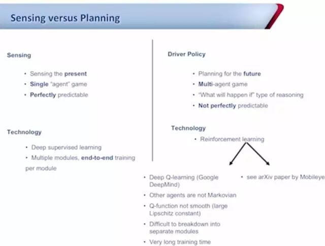 第三个方面,也是自动驾驶技术公认的难点,即决策与规划技术。目前Mobileye也在利用深度学习进行初步的尝试,跟DeepMind采用的DQN网络不同,他们还考虑了驾驶过程中的时序性。
