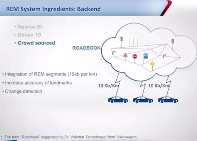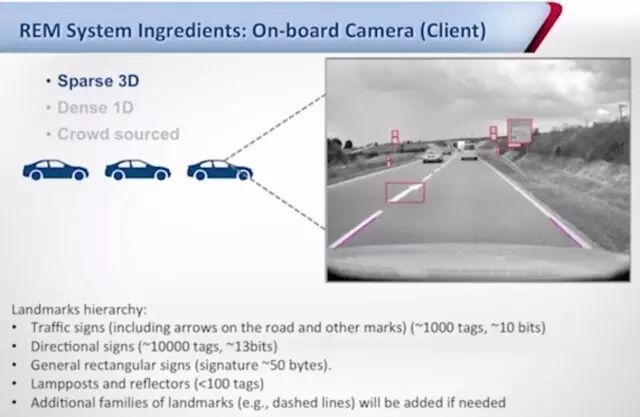 第二个方面,是高精度地图技术(称作REM,Road Experience Management),该技术是自动驾驶不可或缺的支撑,区别是是否使用复杂的3D激光雷达来采集和制作地图,Shashua认为并不需要,而是通过图像中丰富的纹理和色彩特征来生成地图。Mobileye采取的策略是三维上稀疏,地面一维稠密的结构,三维元素不会包括原始图像数据,而是经过识别后的语义信息。