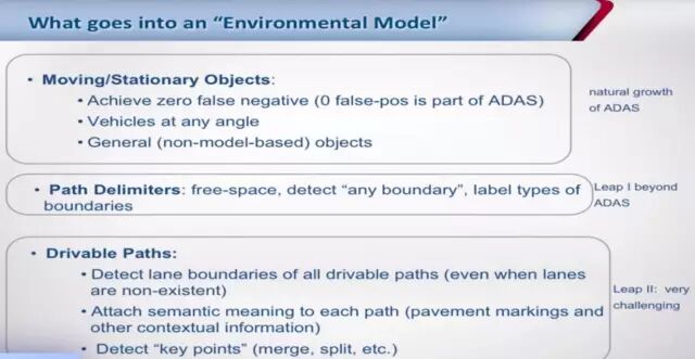当前比较成熟的,是它的感知技术,已经大量运用在已有产品中,主要提供一个环境模型(Environmental Model),包括运动和静止的物体、车道线、可行驶区域和交通标志等。