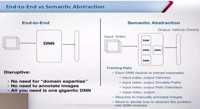 谈到深度学习,就需要提一下现在很火的End-to-End方法。智驾深谈第一期的时候,我们曾经介绍了独行侠GeoHot和他的Comma.ai,Shashua对于端到端方法也有自己的看法,简单来说是不看好的。他认为端到端不考虑专家经验,不考虑领域知识,不考虑人工监督,对极端情况(Corner Cases)的应变能力比较差。相比来讲,Mobileye将感知任务划分成多个模块,每个对应一个人工监督的神经网络,所得出的效果已经可以产品化。
