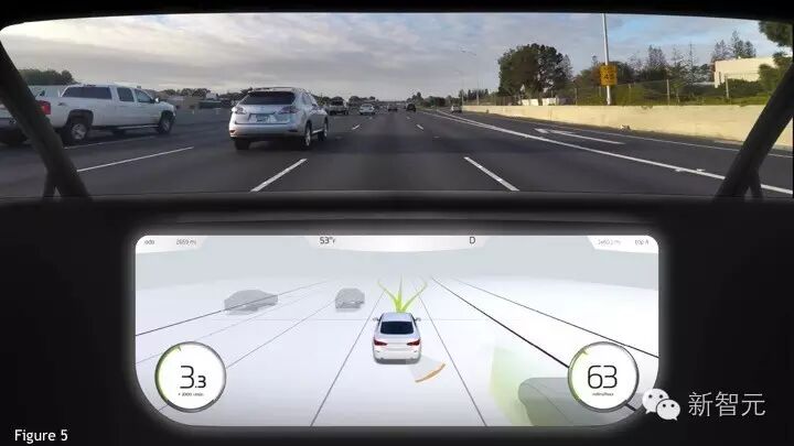 图5展示了一个现实中的驾驶场景,图像来自真实的美国高速公路场景。数据将被输入基于深度网络的自动驾驶系统,并在下方显示了预测结果。中间白色的是行驶车辆,在左侧识别出了两辆车(灰色),右后方识别出了一辆汽车。基于这些车辆的位置和速度,路径规划系统计算出可能的行驶路径(绿色),并最终选择合适的路径。