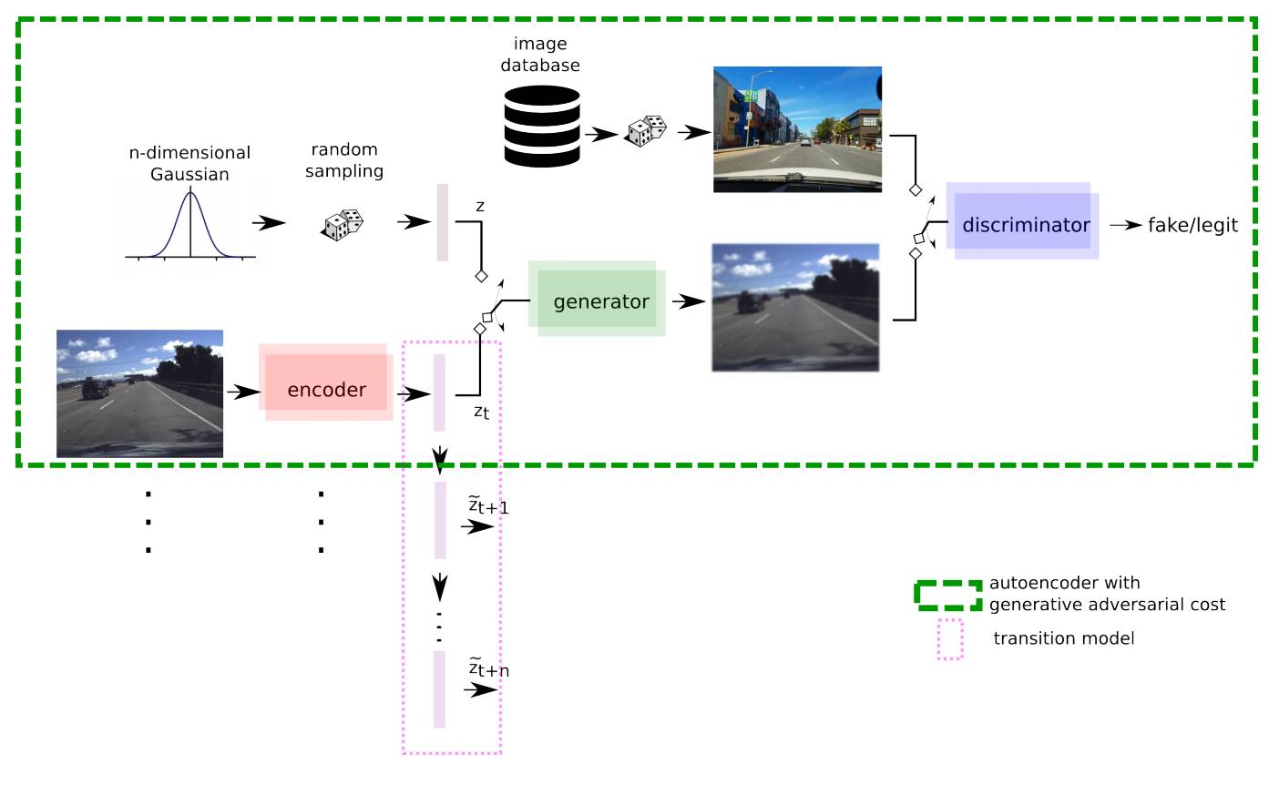 本次GeoHot开源的是第一种方法,且是在真实道路上经过实测的。其基本原理是,将摄像头获得的图像数据,利用Autoencoder编码(如上图锁匙,期间还用到最近很火的GAN),然后用一个RNN深度网络来从人类驾驶数据中学习,最终预测下一步操作。