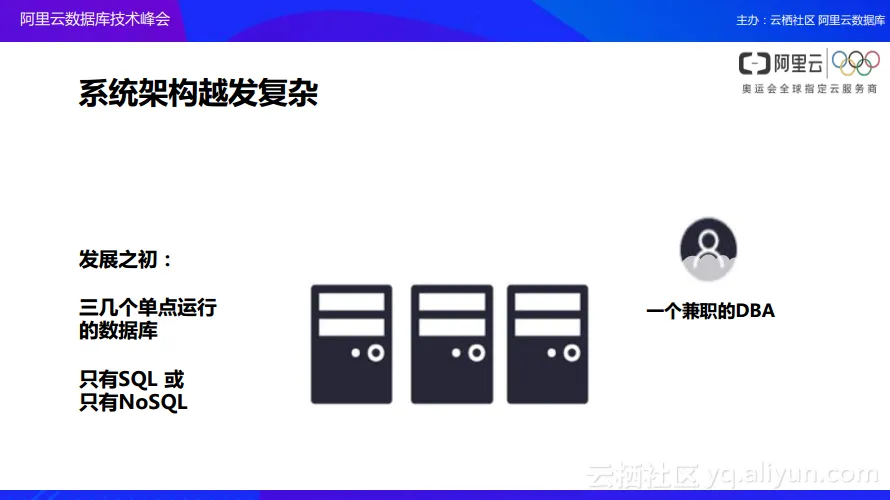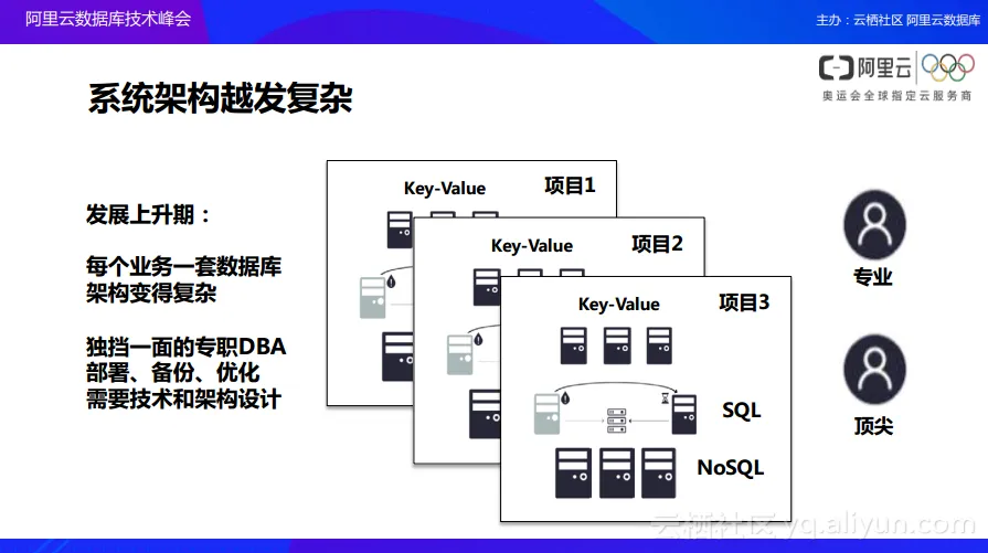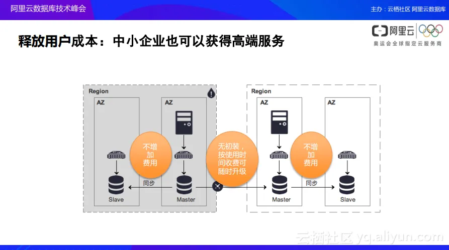 - 第三点,阿里云会直接降低整个架构的构建门槛,在传统企业架构之下,从单个机房变到多个机房或者从单个服务器变为多个服务器的时候,会存在很多技术以及生产成本的门槛限制,阿里云希望能够通过云数据库整体的底层架构,包括飞天架构将这些门槛降到最低。