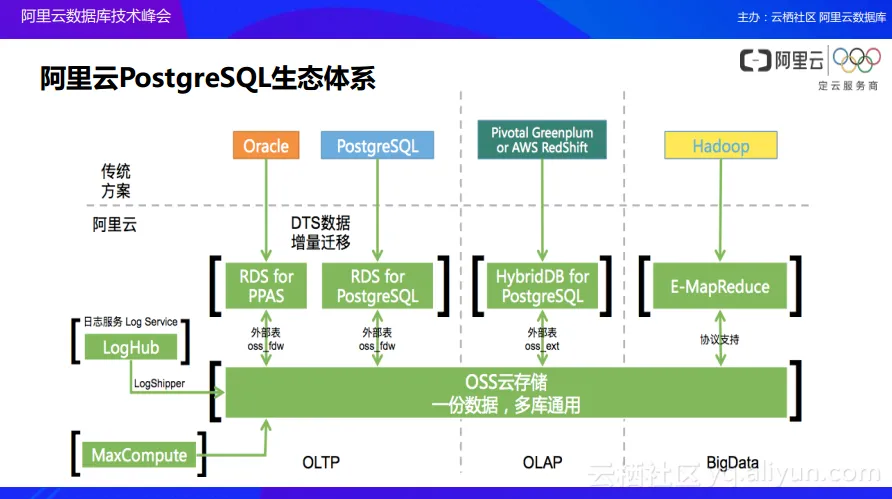 除了MySQL生态之外,近年PostgreSQL生态系统也是非常火热的,阿里云数据库团队在PostgreSQL生态上也沿用了和MySQL生态中相同的思路。阿里云不只是为用户提供一个单独的RDS for PostgreSQL的系统,因为PostgreSQL和Oracle比较相似,所以还会针对基于PostgreSQL的增强版本——RDS for PPS来协助Oracle用户来进行数据迁移。同时阿里云也会推出针对于数据仓库的HybridDB for PostgreSQL来实现数据分析。而且所有的这些体系都可以通过外部表的形式去操作OSS,甚至在OSS上面放一份数据,各个不同的OLTP、OLAP数据库产品都可以对于OSS上的数据进行读写操作和分析应用来实现整体生态链的运行过程。