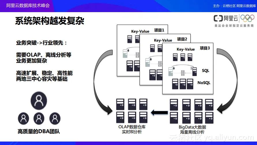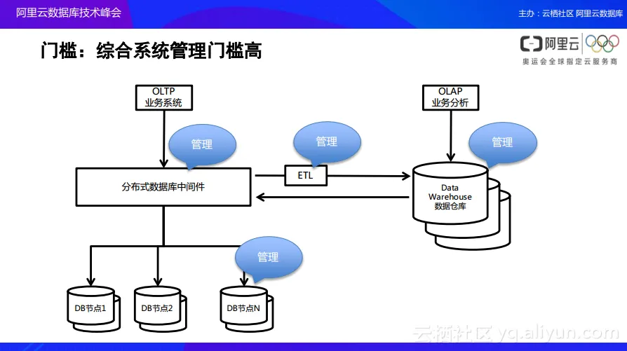 以上分享的是在数据库关系的演进中阿里云提供的一些思考和产品,而下面会分享另外一个问题。如下图所示,当一个业务发展到比较庞大的数据规模时,存下来的业务数据还需要进行产品的分析,比如当数据量已经存放到两三年的时候,企业主肯定希望能够通过这两三年沉淀的数据来进行业务分析。这个时候,在传统的架构之下,往往会向如图中所看到的把数据通过ETL,也就是数据导入到数据仓库,并在数据仓库之上再去做OLAP的业务分析。同时由于数据量越来越大,因此也需要通过分布式的数据库中间件实现一个动作,也就是将整个的数据库进行分库分表式的管理。当然,这样的功能在互联网圈已经使用的非常多了,但是大家会发现下图中存在四个蓝色的管理标记,这是因为在每个层级当中都需要对于数据库进行一些单独的人为操作和人为干预。