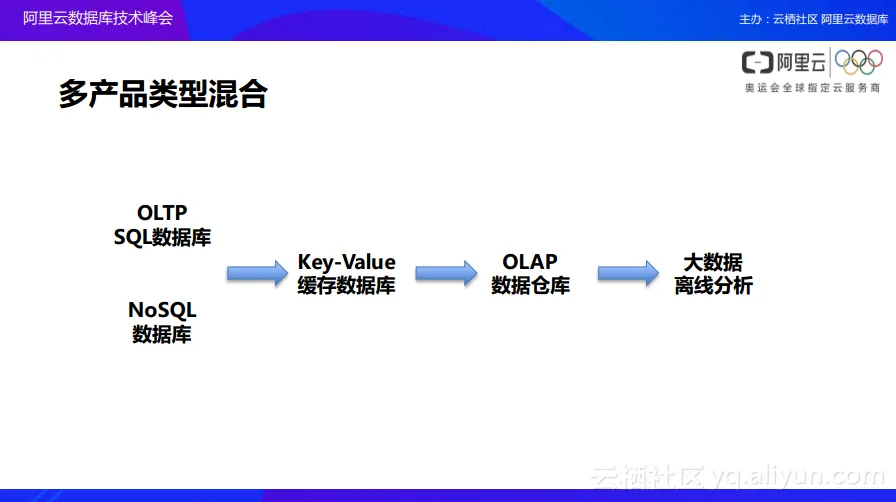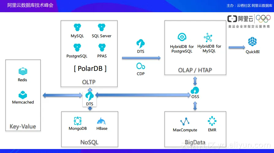 除了上述提到的阿里云为拆分的MySQL和PostgreSQL生态链打造的独特的方案之外,阿里云数据库还会与阿里云的各种数据链路的软件进行整合规划。在下面这张图中,大家可以看到,通过阿里云的DTS以及CDP这样数据工具,可以将前端的Key-Value的缓存层、OLTP、NoSQL、分析以及Big Data进行整体数据的打通。云上的数据可以通过比较方便的方式加上业务架构的模型开发就可以实现对于所有数据在各个数据产品之间的无缝打通,并实现了整体的数据交换。交换完数据之后就可以让各个数据系统更大地发挥自己的业务价值。