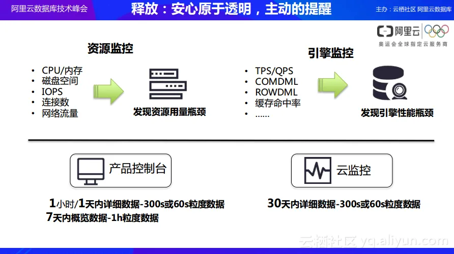 - 最后要提到的也是本次中最希望分享的一点就是:在云数据库之上,阿里云所希望达到的终极目标是解放DBA。其实通常情况下在一家公司里面,DBA很多时候往往不会受到很大的重视,因为在企业中DBA日常所做的工作往往是像部署、备份等等一系列运维工作,而这些工作将会占据DBA 50%到60%的时间,而这些工作却没有办法去为企业带来直接的生产效率。而在云数据库上面,通过云架构的自动化管理来完成所有的运维工作,DBA可以将自己更多的时间投入到业务架构的优化之中。什么是业务架构的优化呢?比如表结构设计的不合理需要进行优化,一些SQL存在性能问题需要优化,以及某些设计在业务发展的过程中已经不合时宜需要优化,所有的这些优化都是DBA应该去做的。而DBA也是最容易发展成为企业核心架构师的一群人,他们的工作应该更多地为企业真正地产能以及技术能力的输出发挥贡献,而不是去过多地关注每一天的部署、备份这样繁琐的运维工作。