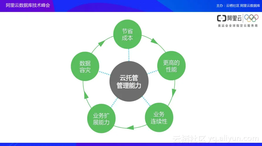 大家可以看到,在阿里云数据库业务中比较注重的就是如下图所示的五点:如何帮助用户节省成本,如何使数据库的性能达到更高,如何维护业务的连续性,以及业务扩展能力和数据容灾等。而这一切的能力都是通过云托管平台进行规划和赋能的。
