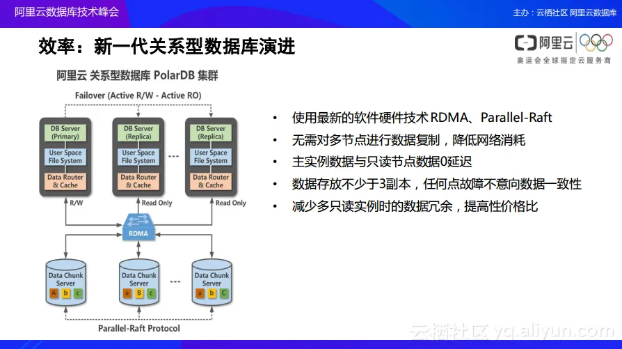 而在PolarDB中,阿里云尝试使用了一种新型的架构,通过RDMA网络会将下层的各个存储节点进行整合管理,通过分布式Raft协议实现完整的底层集群。这样所能达到的效果就是当主节点进行数据写入的过程中,底层的Raft协议的数据集群会把数据自动打散到三个或者以上的存储节点上面,同时这些数据一旦写入,在其他的只读节点上就可以读到。因此可以看到在这样的架构之下,减少了多节点之间的数据复制,网络带宽的消耗会更低,同时主节点和只读节点之间网络数据延迟基本为零,也就是说只要数据写入了,只读节点就能够读取到,符合ACID的完整原则。所有的数据在存放的时候都不会少于三节点,任何一个节点或者数据模块出现故障的时候,都不会造成数据丢失。在这样的架构之下,可以进一步使得数据库的使用者获取更高的性价比。