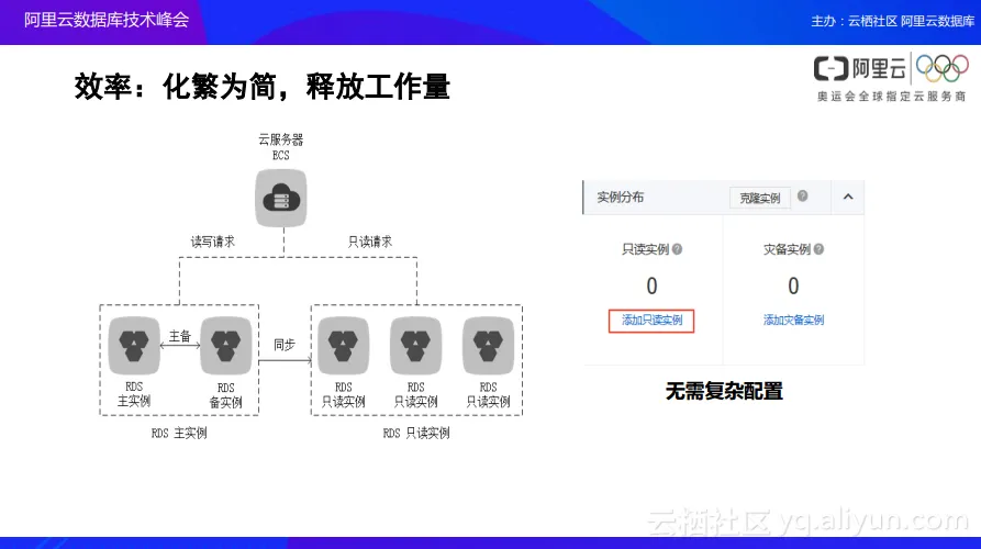 在有了数据库的运行环境之后,其实大家可以看到各个用户往往都会有自己不同时段的类似于促销、活动等的一些业务,在这些业务之中,用户的查询要求往往是非常高的,会出现非常高的查询峰值,这时可以通过只读节点来进行解决。在阿里云中就直接提供了只读请求的实例,而不需要用户自己再去搭建只读实例了。如果大家自己搭建过数据库,就可能对于这个过程有所体会,当搭建一个只读实例时往往需要去构建或者配置3到4个配置文件,而且各个主机之间,包括用户权限以及密码的同步等都需要进行规划,这个过程对于初级的DBA而言是比较困难和麻烦的事情,而且与此同时还需要保障整个系统在业务发展的过程中的稳定运行。