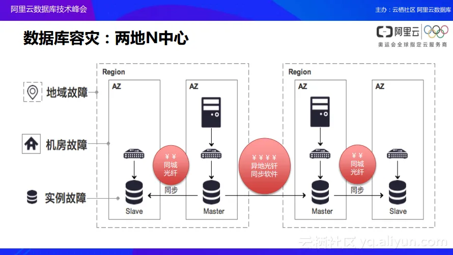 在企业发展的过程中,随着业务不断地发展,需要更好地保障业务的连续稳定性。对于很多企业而言,数据库中心里面往往只有一个IDC的机房,然而如果这个IDC机房出现断电或者故障的时候,就没有办法进行更进一步的业务操作。阿里云在数据库体系之下已经完成如下图所示的整体架构。当大家看到阿里云数据库产品购买页的时候会发现阿里云不仅提供了单中心的双节点模型,还在很多地域中提供了多可用区的模型。多可用区模型就是把主节点和备用节点放在一个城市的两个不同的可用区上,也就是说用户的实例只购买了一个,但是在部署的时候却部署在了一个城市的两个中心,一旦主中心出现整体故障的时候,用户的业务依然可以通过切换到备用中心继续提供服务。大家可以想象,如果没有云架构的支撑,依靠自己搭建多可用区模型的时候,可能会需要非常高的业务成本,这是因为同城之间光纤搭建的费用是非常昂贵的。