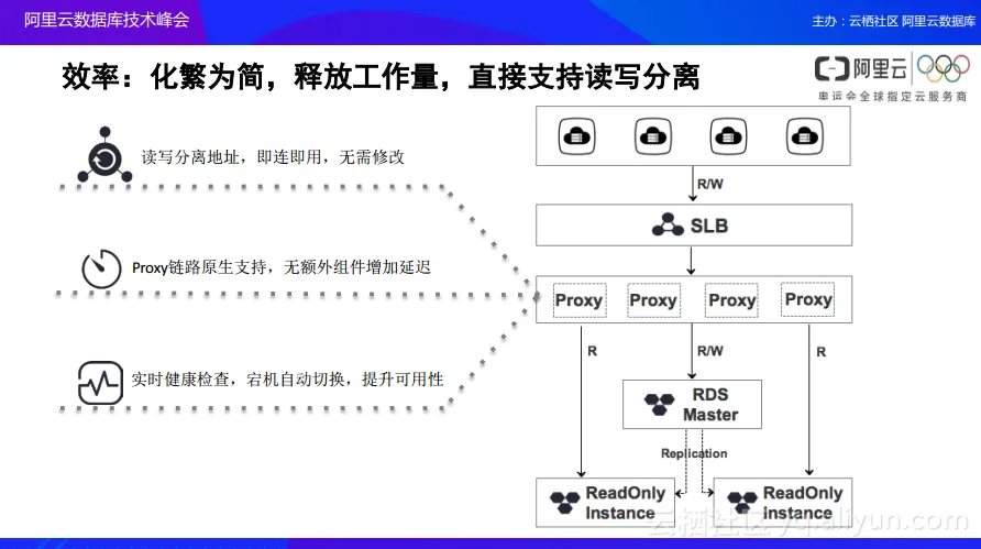 针对上述的问题,阿里云的数据库在发展的过程中也会收到用户的需求和报告,因此阿里云数据库就进行了进一步的优化。在只读实例的运行条件之下,阿里云数据库还进一步地提供了读写分离的IP访问,其主要会在Proxy业务层底下实现所有SQL的收集,并且对于所有的收集到的SQL进行分类,如果发现SQL操作既有读操作也有写操作的时候,也就是读写操作在同一个事务里面的时候,会将这些操作自动地提交到主节点。而如果当发现事务中所有的操作都是读操作的时候,Proxy层就会将这些只读的查询平均地分配到各个只读节点。这意味着应用程序不需要改变本身的代码,阿里云就能够自动地为用户实现读写分离的工作,而业务方不需要去修改自己的业务代码。通过这样查询的读写分离的功能,可以非常好地简化本身开发以及维护的工作量。