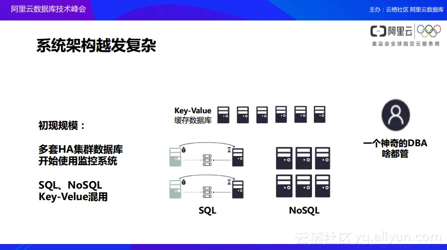 更进一步,当企业发展到初具规模的时候,数据库往往就不能够以单节点的方式去运行了,此时往往需要配合一些集群以及一些其他的数据库。例如在刚刚开始的时候,只用到了单独的SQL数据库以及NoSQL数据库,但是在系统初具规模的时候,可能两方面的数据库都会用到,同时还可能会用到像Key-Value缓存数据库等进行混合来实现整体的数据库业务效果。在这个过程之中,DBA扮演着非常神奇的角色,此时的DBA不只需要去做普通的SQL系统管理,而且还需要管理NoSQL以及Key-Value数据库,而且很多时候整体系统监控以及系统维护都需要由DBA进行完整地支撑,此时的DBA可以称之为“神奇的DBA”,因为他什么都需要管。