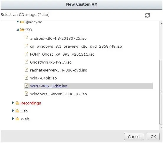 点CD Image,跳出下拉菜单,选择预先准备好的各种系统安装盘,我选择装个32位的WIN7。