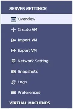 左侧分栏是服务器设定区,依次是:概述,创建虚拟机,导入虚拟机,导出虚拟机,网络设定,快照,系统日志,首选项。