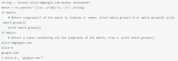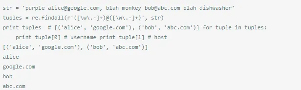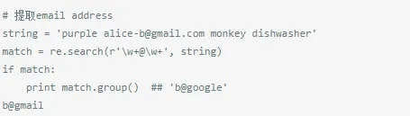 有时候需要提取匹配字符的一部分,比如刚才的邮箱,我们可能需要其中的username和hostname,这时候可以用()分别把username和hostname包起来,就像r'([\w.-]+)@([\w.-]+)',如果匹配成功,那么pattern不改变,只是可以用match.group(1)和match.group(2)来username和hostname,match.group()结果不变。
