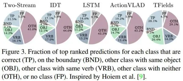 该文首先给出了一个例子,即Two-Stream方法在Charades数据集上的测试结果,第一行为正确的检测,后面几行为不同的错误检测例子。