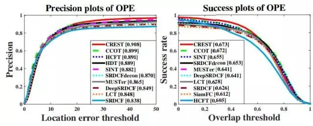 可以看到,本文提出的CREST算法在挑战性的场景中,性能优于目前主流的跟踪算法。