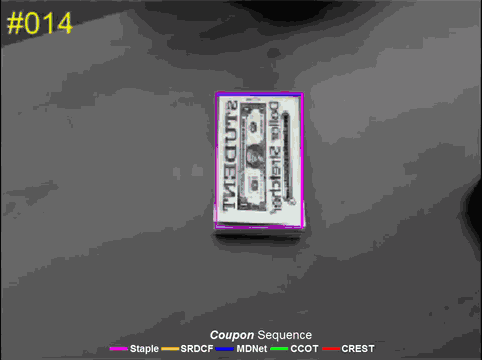 下面是直观的跟踪效果展示,在标准数据库OTB[6]上比较了新方法CREST和目前主流的跟踪方法Staple[7],SRDCF[8],MDNet[4],C-COT[3]。以下为这些跟踪算法在一些挑战性场景下的效果。