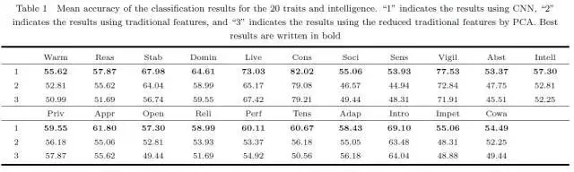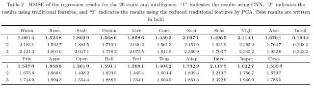 实验结果显示:“自律性”(rule-consciousness)、“乐群性”(openness)、“有恒性”(perfectionism)、“紧张性”(tension)的错误值较其他人格特征小,而“世故性”(social boldness)、“怀疑性”(vigilance)和“内外向性”(introverted or extroverted)则更大。这意味着后三种人格特征与面部特征关联较小。相比之下,智力的拟合误差(fitting error)高,因此很难通过面部图像准确预测一个人的智力水平。