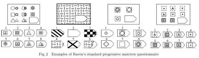 本文采用了英国心理学家瑞文1938年设计的“瑞文标准智力测验”(简称SPM),旨在测试志愿者的观察力及清晰思维的能力。为表示受试者的智力水平,测试结果被转换成了百分数。整个测试由60个问题组成,分为ABCDE五组,每组12个问题。从第一组到最后一组,难度逐渐上升,每组内部的问题也是由易到难。完成每组题目所需的思维能力均不相同,参与本研究的186位志愿者全部完成了该智力测试,得到的分数用于智力水平分析。