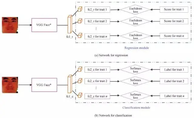 本文将人格预测问题转化成分类问题和回归问题。为构建分类标签(classification labels)和回归目标(regression targets),人格特征分数和智力测量分数都转换成了相应的值。本文利用CNN来解决上述两个问题,输入信息是面部图像,其对应的人格特征和智力水平在测试阶段(training phase)作为标签使用。