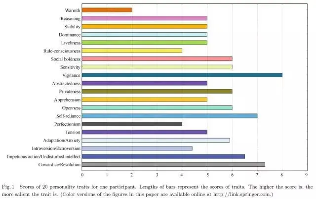 本文采用了“卡特尔16种人格因素问卷”(简称16PF)来测量志愿者的人格特征。16项人格因素为:乐群性、聪慧性、(情绪)稳定性、恃强性、兴奋性、有恒性、敢为性、敏感性、怀疑性、幻想性、世故性、忧虑性、实验性、独立性、自律性、紧张性。所得到的测试数据,经由北京师范大学教育培训中心研发的软件进行处理后,可对每一种人格作出1--10分的评分。在16个人格因素的基础上,卡特尔进行了二阶因素分析,得到了4个二阶公共因素,即适应与焦虑性、内外向性、感情用事与安详机警性、怯懦与果敢性。本文的实验综合使用了上述20种人格特征来分析每位志愿者的人格特征。