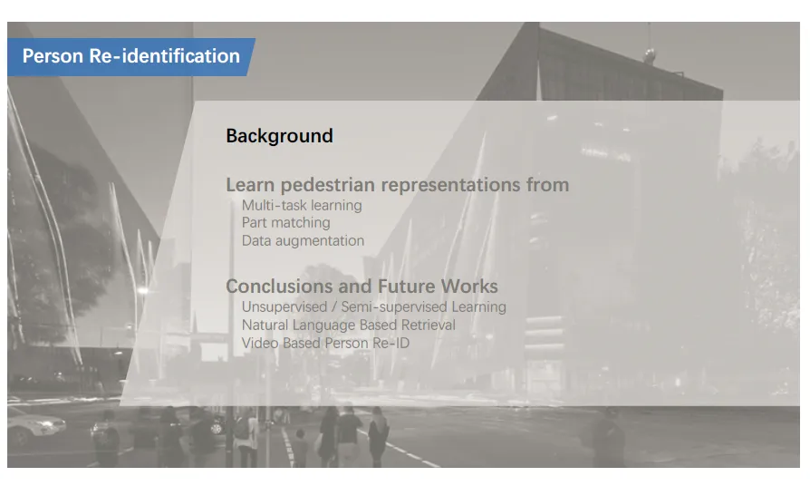 行人重识别是计算机视觉领域一个偏应用的问题,主要涉及智能安防/智能监控,可以应用于大型公共场所,如主题公园/机场/大学校园 来寻找指定行人。嘉宾将主要介绍深度学习相关的行人重识别方法。