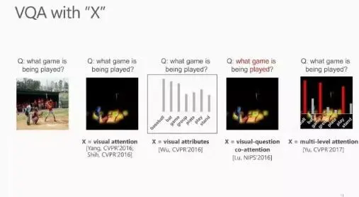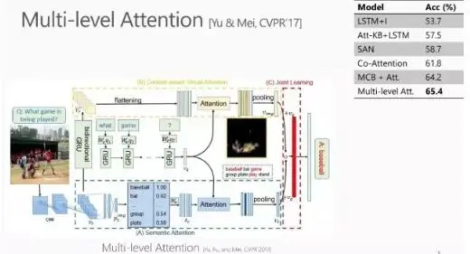 我们今年被CVPR 2017接收的一篇论文中还提出了 multi-level attention:即先学习一个初始的 attention,然后通过image 中不同 region 之间的关系以及问题中不同词素之间的关系来学习 multi-level attention。
