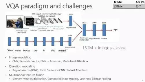 先使用 CNN 学习图片蕴含的特征,同时使用 RNN 学习描述问题的句子中包含的特征,然后将这两个特征进行融合,并对使用 Softmax 等方法对其进行处理来得到最终结果。