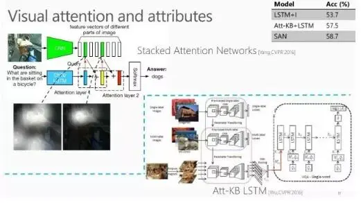 该方法是先使用CNN学习图像的特征表示,然后以迭代的方式使用LSTM对问题进行学习,使得注意力逐步集中到问题关注的方面。他们在VQA 网络中加入Stack Attention这个模块之后,准确率可以从53.7%提升到58%。
