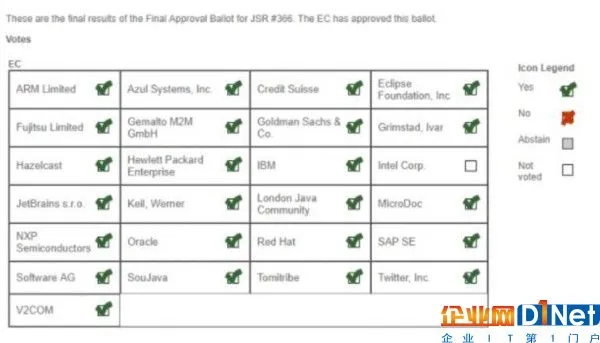 在 JCP 主页上,我们可以看到,在 8 月 21 日,JCP 执行委员会以 24 票赞成票通过了 JSR #366 的最终批准投票。其中,英特尔公司放弃了投票。