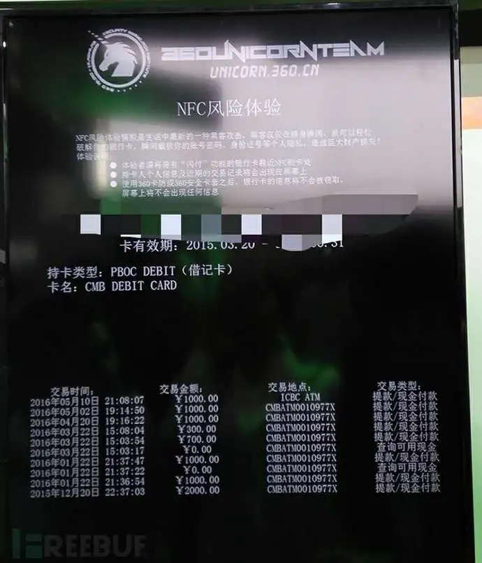 在CES 展上,360卡防受到了特别关注。小编在现场做了测试,当银行卡接触到NFC装置时,个人信息、消费记录、交易地点将一览无遗。