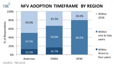 TBR Research发布的2H16电信软件媒体网络(NFV/SDN)用户调查报告表明:“全球的电信运营商都在不断发展NFV,但美洲地区的电信运营商发展最快,这得益于美国的大规模采用。在亚太地区,参与调查的电信运营商中只有20%表示将在今年内采用NFV技术,而剩下的80%受调查的电信运营商计划在未来的一两年内采用NFV技术。”(见表)