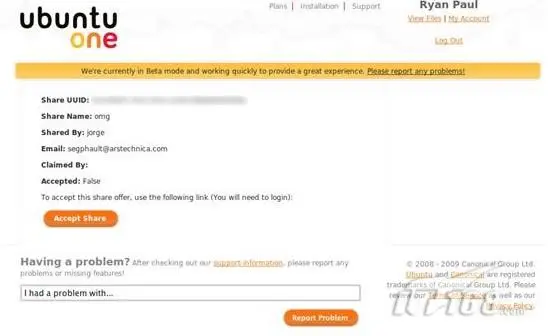 就目前放出给用户测试的Ubuntu的功能来说,用户除了可以同步自己想要备份的文件外,还可以用E-mail的形式和想要分享文件的用户分享同步到Ubuntu上的文件。而整个Ubuntu One云服务正如他的名字一样,并没有为Windows和 Mac OS用户设计客户端。