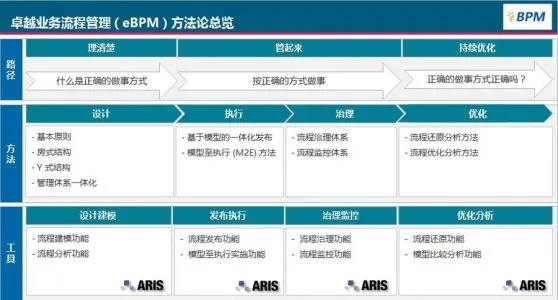 博阳咨询是Software AG公司在国内最早的合作伙伴之一,其开发的eBPM 方法论包括路径、方法和工具三部分的内容,是基于 ARIS 中蕴含的管理理念结合大量实践经验,创造性提炼出的一套流程管理方法论。
