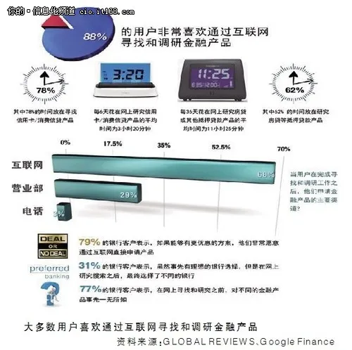 Forrester调研报告发现,2012年英国人至少一次网上调研和申请金融服务的比例上升到50%之多,而2007年仅在22%左右,像汽车保险、消费贷款的网上申请已成为英国金融市场的主流模式。随着年轻网民正在成为消费主体,金融产品的在线化和电商化在全球加速。在中国,在线的信息查询和对比会成为网民购买金融服务的一种普遍习惯,人们获取金融产品的方式正在发生革命性的变化,多渠道环境已经成为现实。可以确定的是,相比较传统的银行查询方式,在线式金融服务使用户在时间成本和信息获取质量上都有了质的飞跃。
