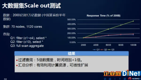 用Carbondata+Spark数据优化后,可以解决既要点查又要处理报表的情况。下图是一个从2000亿到1万亿的性能测试数据,Q1是过滤查询,Q2也是过滤查询,Q1跟Q2数据查询因为用了Carbondata索引,需要扫描的数据不会增长很多,数据量增长5倍,查询时间增长不到1倍。第三个查询是full scan查询,主要考察的是spark和carbon的可扩展性,测试过程中发现扩展性是非常线性的,scalability很好。