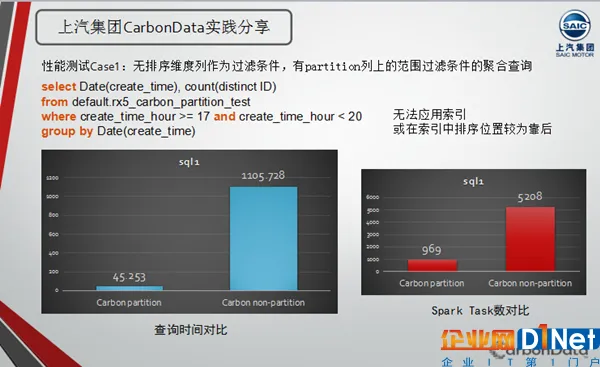 上汽在CarbonData项目的实践分享在案例分享环节,曹鲁以上汽的数据作为测试数据,分析了CarbonData Partition table和非Partition table条件下的加载性能和查询性能对比。并给出了CarbonData Partition的性能调优建议。本文为大家展示其中的无排序维度列作为过滤条件,有partition列上的范围过滤条件的聚合查询情况的对比结果,如图不难看出,原始查询方式的耗时是添加partition性能查询方式耗时的25倍。